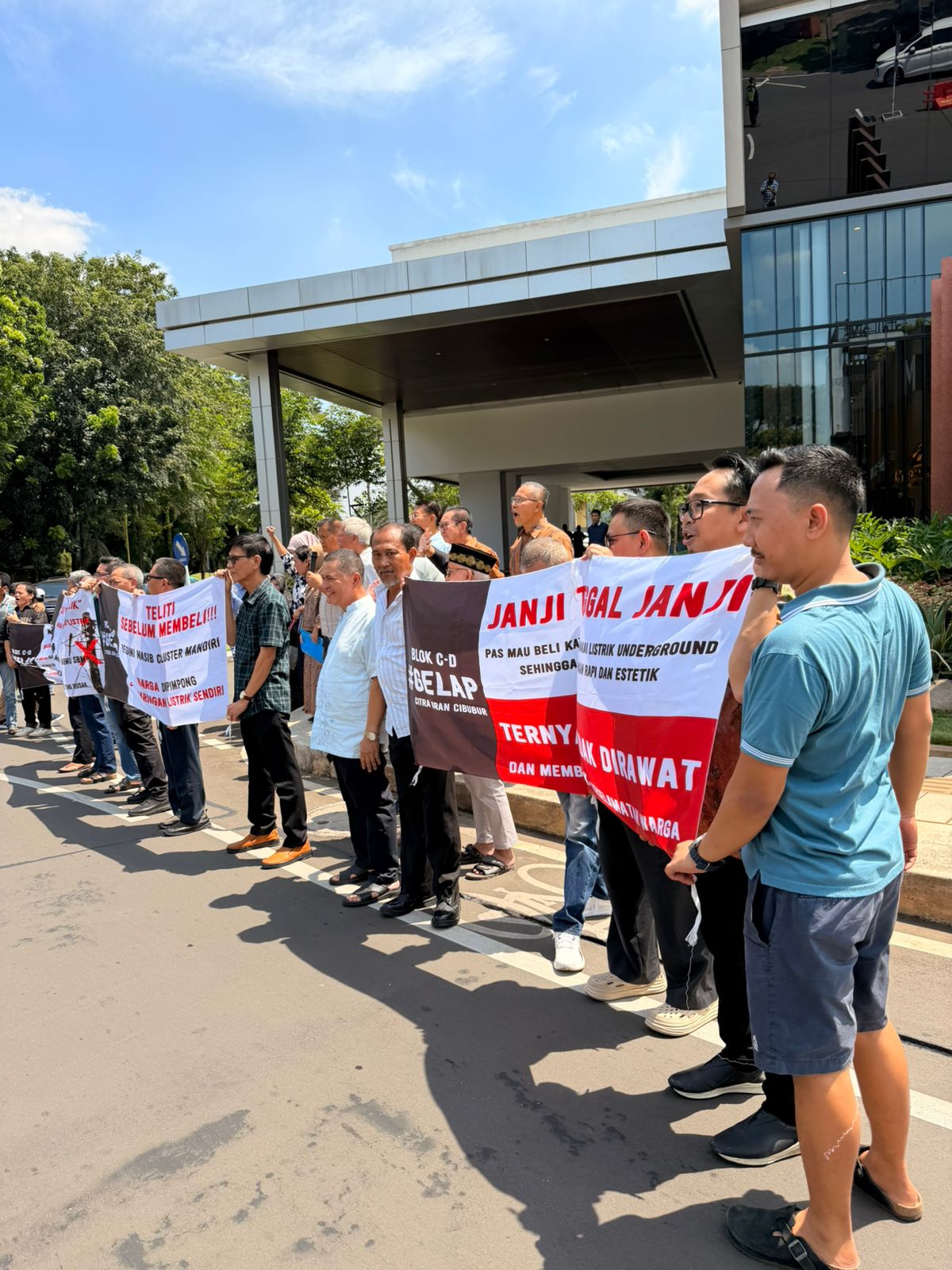 Dalam aksi tersebut, warga membawa sejumlah spanduk berisi tuntutan agar pengembang segera memperbaiki jaringan listrik bawah tanah yang disebut telah mengalami berbagai kerusakan selama sekitar 11 tahun terakhir. Mereka juga mendesak agar fasilitas kelistrikan tersebut segera diserahkan secara resmi kepada PLN.